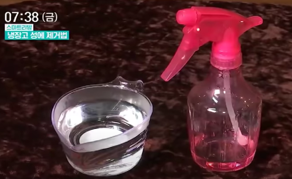 3. 분무기에 따뜻한 물을 넣고 성에가 낀 부분에 뿌린 후